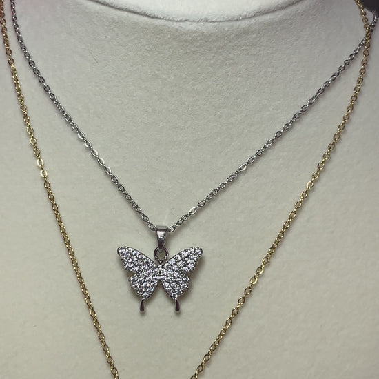 If you or someone you know likes butterflies, this dainty necklace is the perfect addition! Perfect to layer or wear on its own, the Britta Butterfly Necklace features stainless steel with 18kt gold plating. A butterfly drop charm with micro inlaid cz stones hangs from a dainty, textured chain. Measures approx 16-18" long. Choose gold or silver.