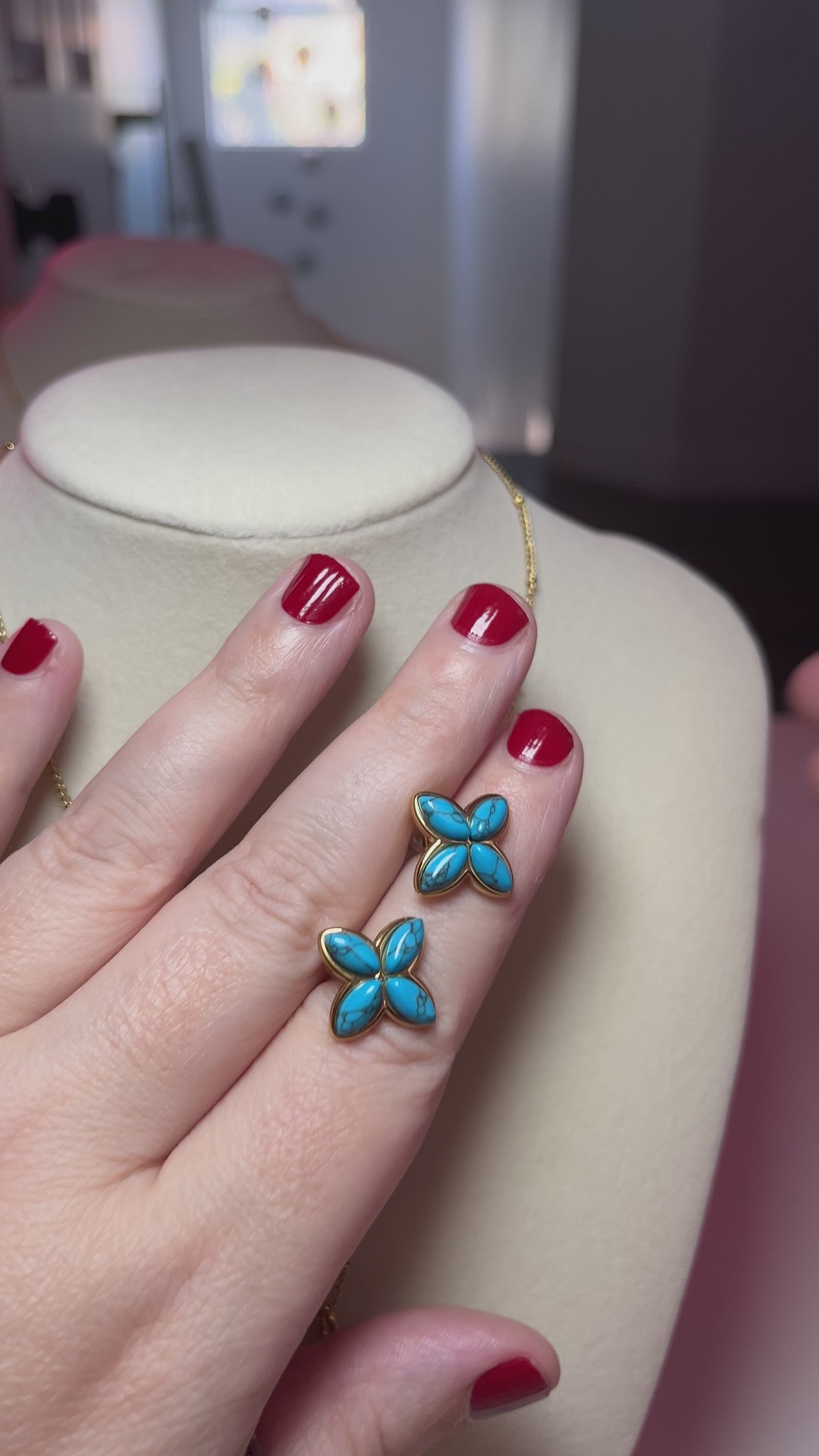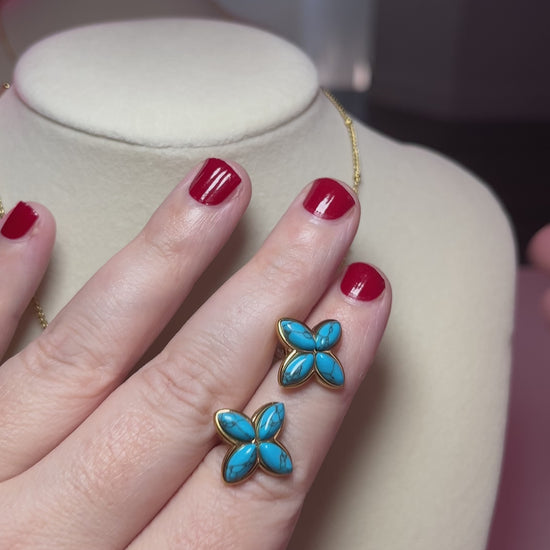 Add a pop of color all year long with the Carissa pieces! These stud earrings features a floral-style statement studs made of stainless steel with 18kt gold plating and genuine turquoise. Measures approx 0.7" diameter. Matches the Carissa Necklace!