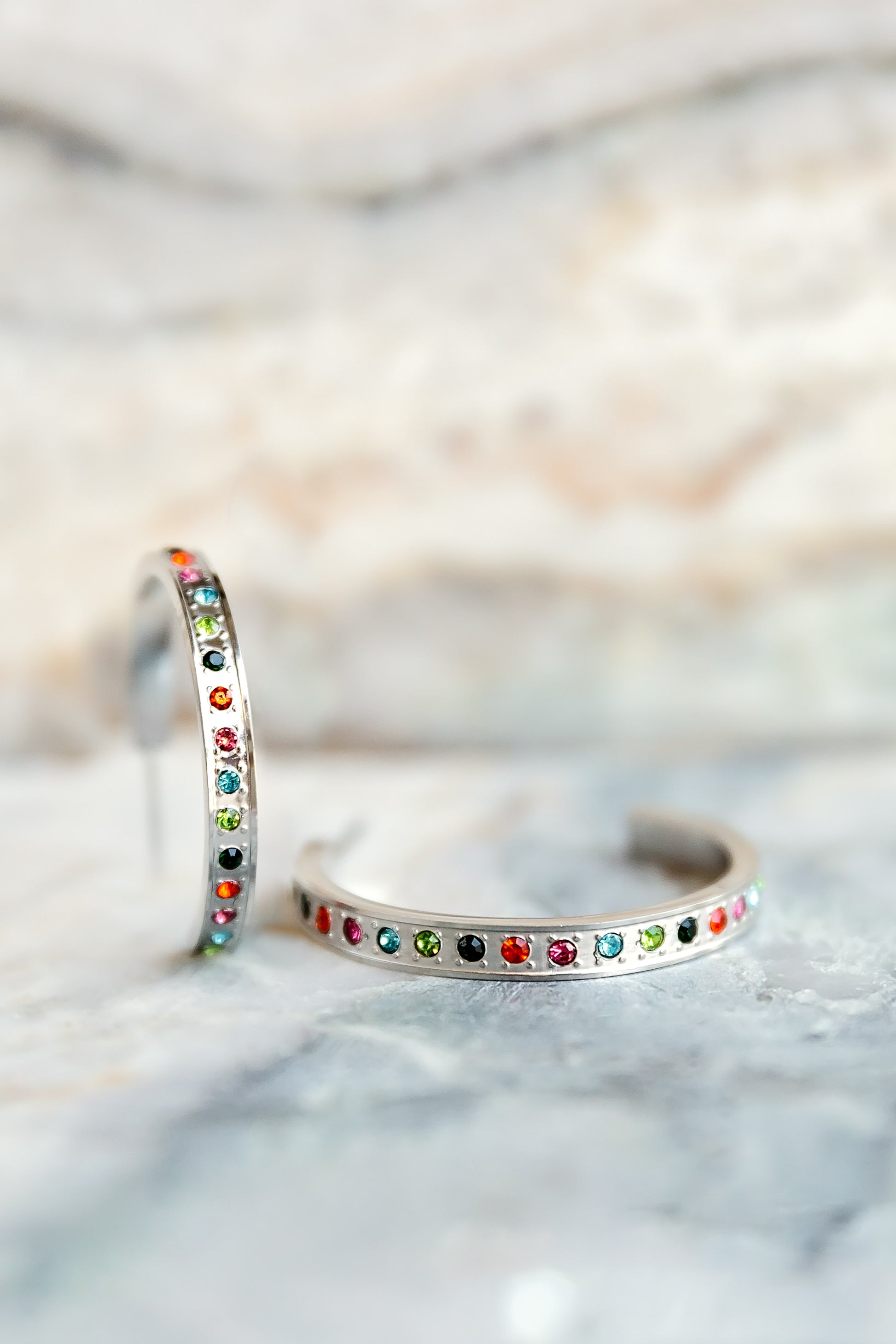 The Darcy Hoops are a colorful, playful addition while remaining chic and classy. Featuring stainless steel with 18kt gold plating and colorful inlaid CZ stones. Perfect for everyday or dress up for date night! Incredibly sturdy and durable! Measures 1.25" in diameter. Choose silver or gold.
