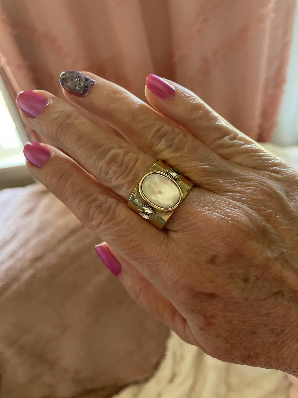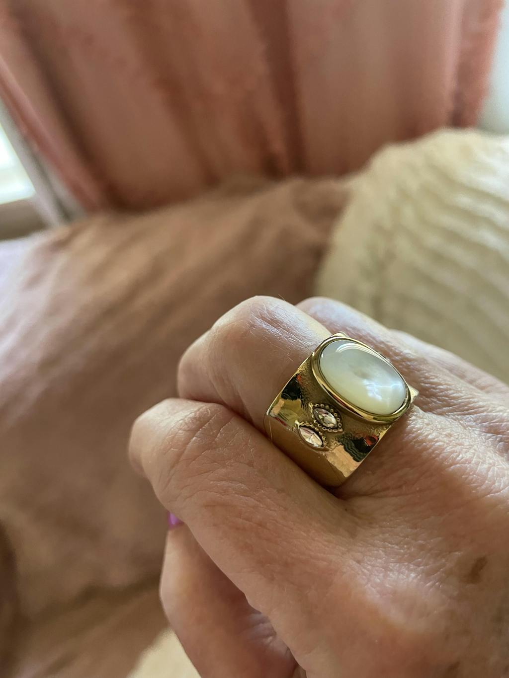 One of our Founder's Favorites, this statement ring is stunning! Featuring crystals. genuine opal and stainless steel plated with 18kt gold, this statement ring is chunky, funky, yet remains a classic. Measures 16mm in width. Choose gold or silver. Available in sizes 7-11, runs a bit snug, so if you are between sizes, we suggest sizing up.