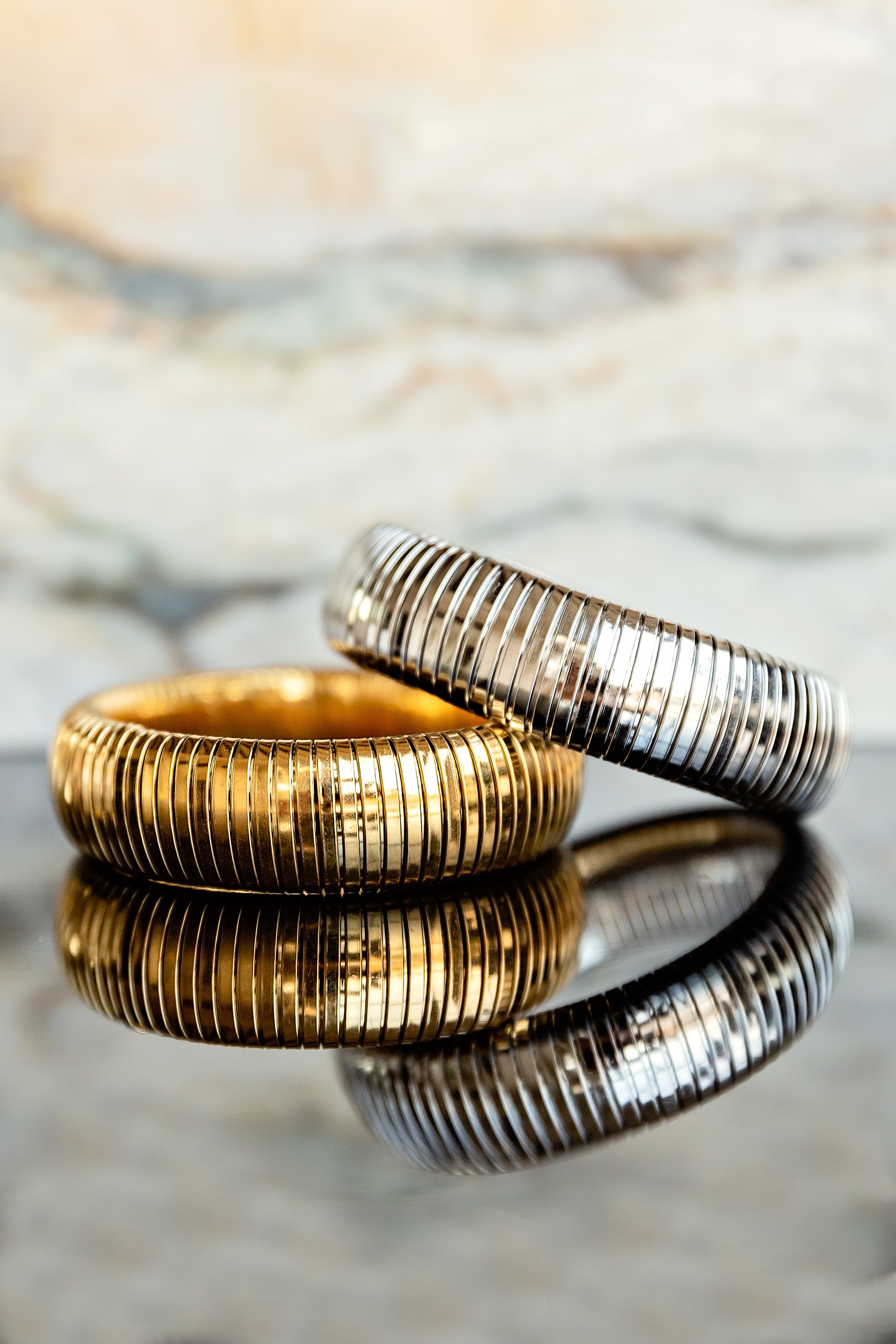 The Maxine Bangle brings bold texture and modern shine to your stack. Crafted from stainless steel with 18kt gold-plated and silver-plated options, its ridged design creates a striking, sculptural look that feels both timeless and contemporary. Hypoallergenic, durable, and beautifully weighted, Maxine is stunning worn solo, and even more eye-catching when paired with its contrasting twin. A true Smart Luxe statement piece.