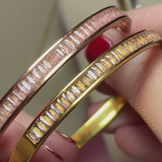 To have "moxie" is to have strong character, values and determination. And you will certainly channel your moxie while wearing this gorgeous bracelet! Pair them together or wear layered up your arm with your favorite bracelets. Made of titanium steel with 18kt gold plating and pink baguette cz stones. Choose gold or rose gold metal color. Limited quantities!