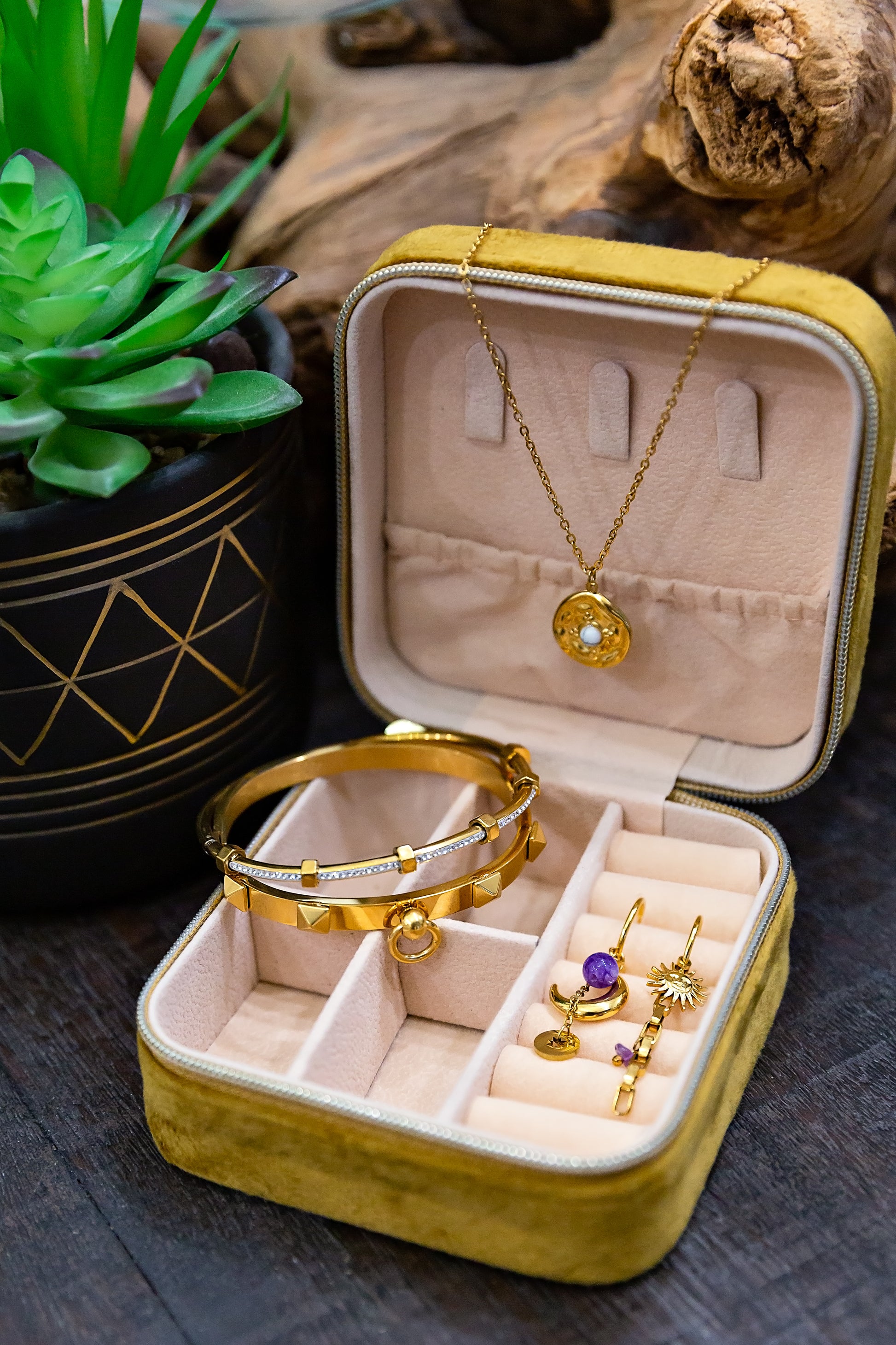 Hop on the fall trend and don these asymmetrical Mystic Earrings for the season. These small huggie hoops feature a unique design, each earring featuring different drop charms. These earrings are made from stainless steel with 18kt gold plating, featuring genuine amethyst stone, sun & moon charms with chain link design. Charms can be removed. Huggie measures approx 0.5" diameter, total drop length is 1.5" long.
