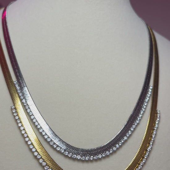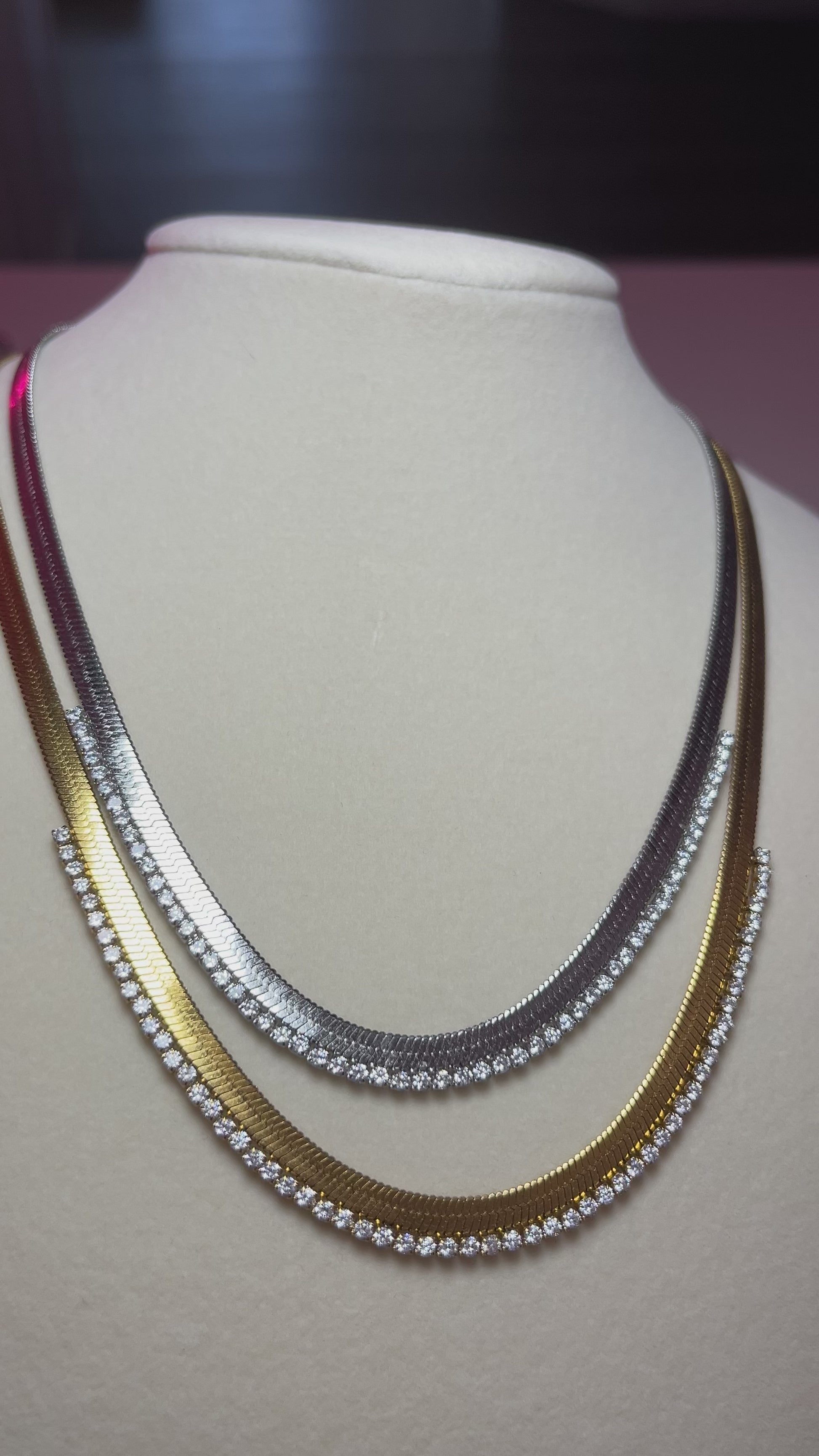 Meet Rowena, an urban glam necklace that is sure to get lots of compliments! Featuring oh-so-durable stainless steel with 18kt gold plating and gorgeous shimmering cz stones, this water resistant necklace can go from office to dinner and then brunch to pool with no issues. This one is a whole lotta chic and is a Founder's Fave! Measures 16" with 2" extender.
