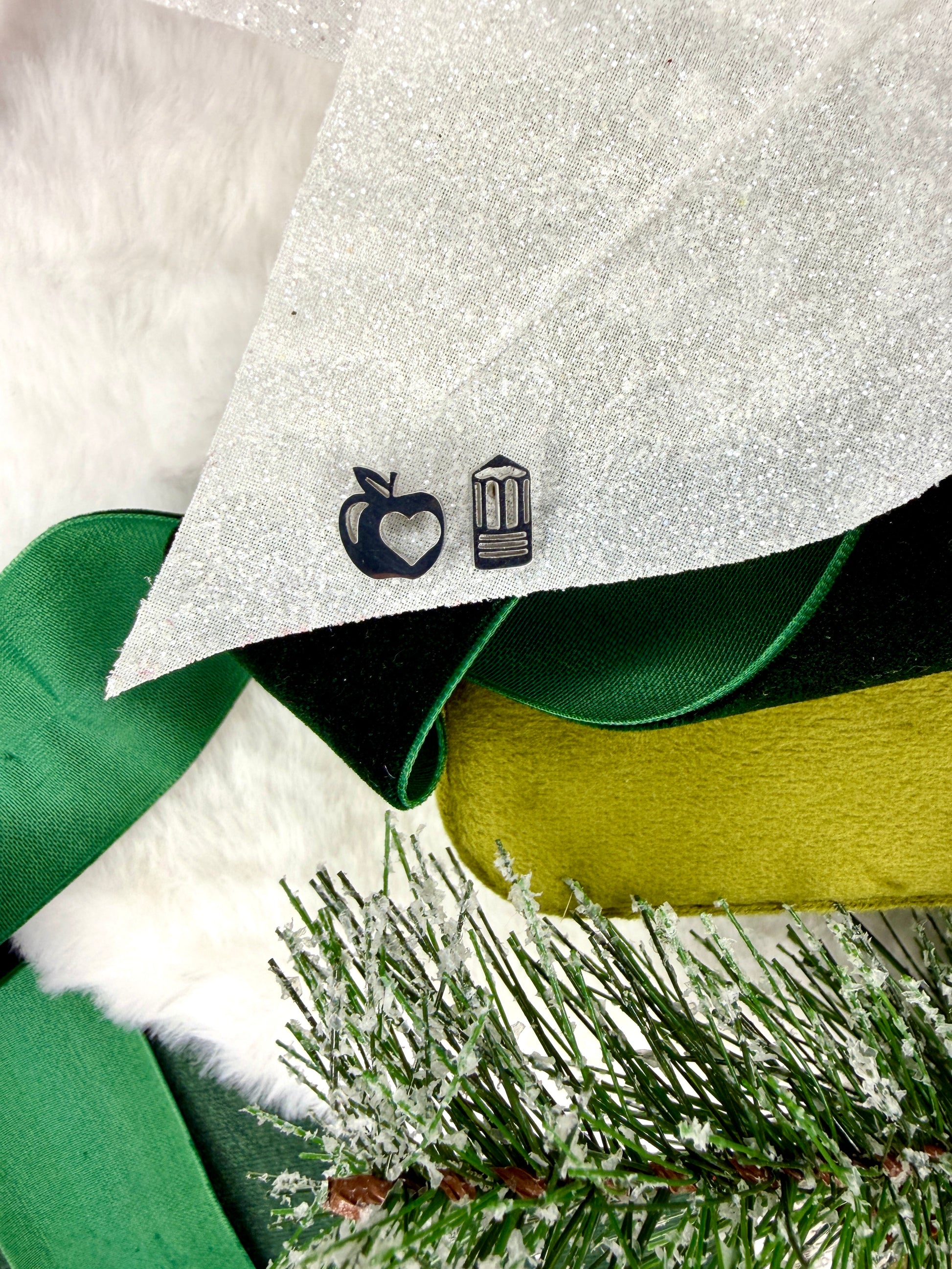 Give the sweetest gift to a teacher or tutor! These silver mini studs are stainless steel with 18kt gold plating. One stud features an apple and the other is a pencil. Simply adorable and makes a perfect gift! Measure approx 0.3" diameter.
