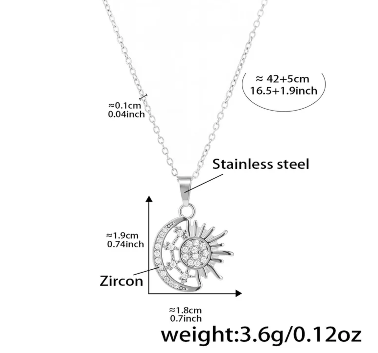This necklace is the perfect gift when want to give someone the sun and moon. Features stainless steel with 18kt gold plating and pavé cz stones. Pendant features a sun and a moon. Measures 16.7" length with 2" extender. Water-resistant and tarnish-resistant. Choose silver or gold.