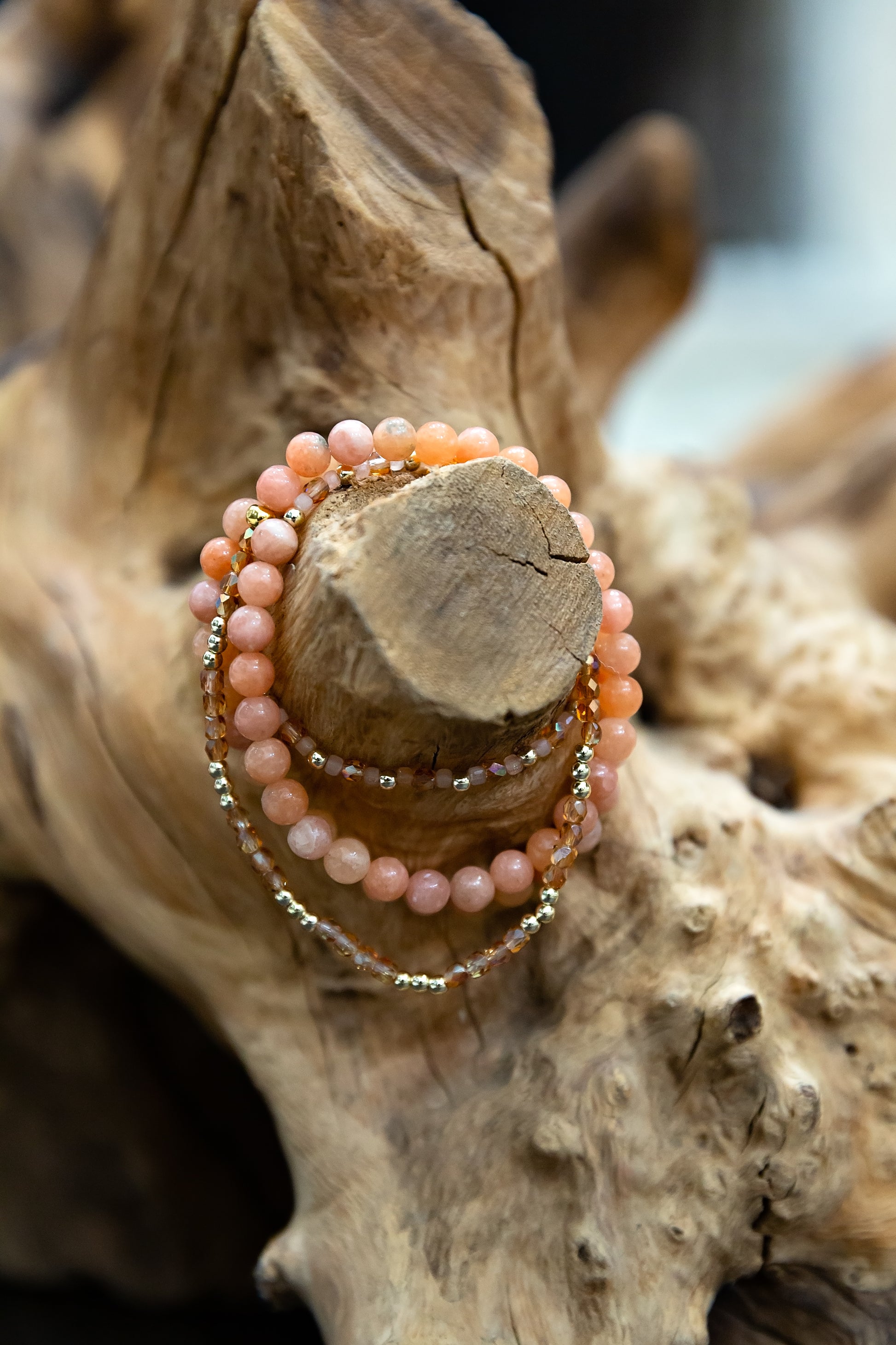 These hand-beaded wrap bracelets will be a treasure in your jewelry box. Each piece was handmade by Ryan Winkler of WINK Workshop exclusive for VEITA Jewelry! Featuring high quality peach calcite and moonstone gemstone beads with tarnish-resistant 18k gold-filled 4mm beads. Wrap it around your wrist four times for a layered look! Pre-stretched to prevent gaping.
